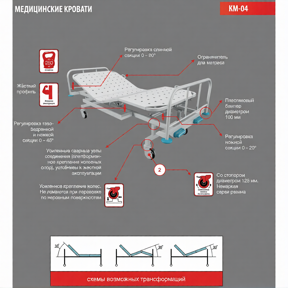 Стационарная медицинская кровать КМ-06 - предназначена для ухода, диагностики, лечения и наблюдения за пациентом в стационарных медицинских учреждениях.