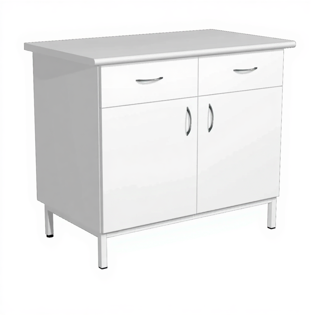 - Широкие возможности кастомизации — доступны варианты изменения высоты, глубины столешницы (600, 700, 800, 900, 1000 мм), выбора материала столешницы (ЛДСП, постформинг, керамическая плита, нержавеющий лист, HPL пластик, полипропилен). Возможно изготовление тумбы из металлического листа с порошковым покрытием.