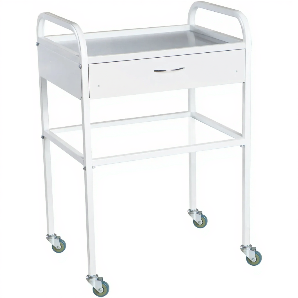 Столик медицинский инструментальный СМИ-02-01 (полки металл, колёса серая резина) — это компактный мобильный столик, предназначенный для размещения инструмента, лекарственных препаратов и приборов в медицинских учреждениях и лабораториях. Модель имеет каркас из профильной стальной трубы, один выдвижной ящик и верхнюю полку из металла.