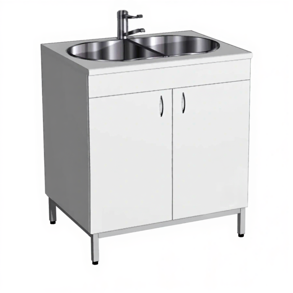 - Двухчашевая врезная мойка — из нержавеющей стали, обеспечивает удобство мытья посуды, комплектуется локтевым смесителем.