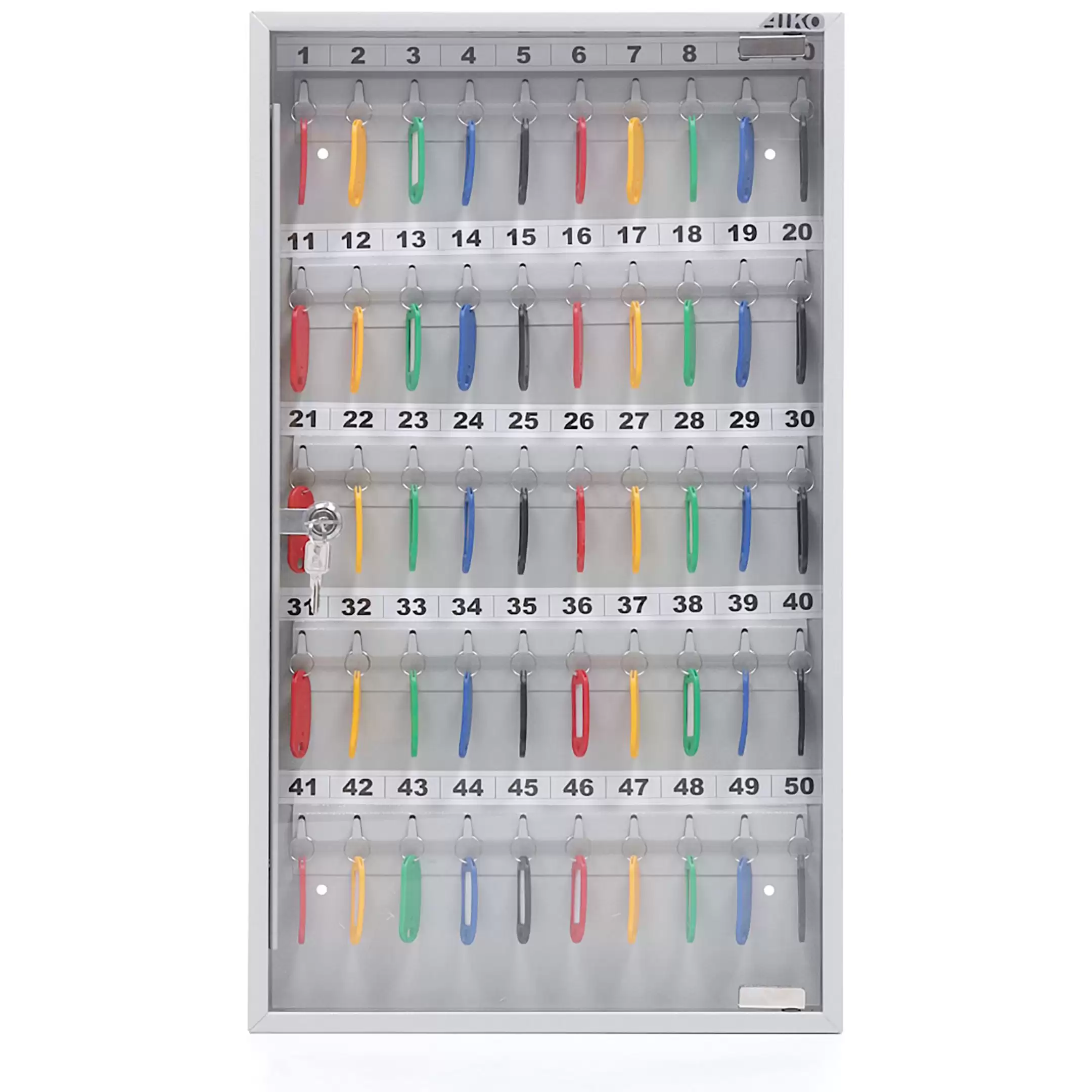 - Оптимальная вместимость для рабочих мест и точек доступа — система рассчитана на 50 ключей, что идеально подходит для организации хранения на стойке администратора, в диспетчерской, на посту охраны или в отделе, где требуется систематизировать и контролировать значительный набор ключей.