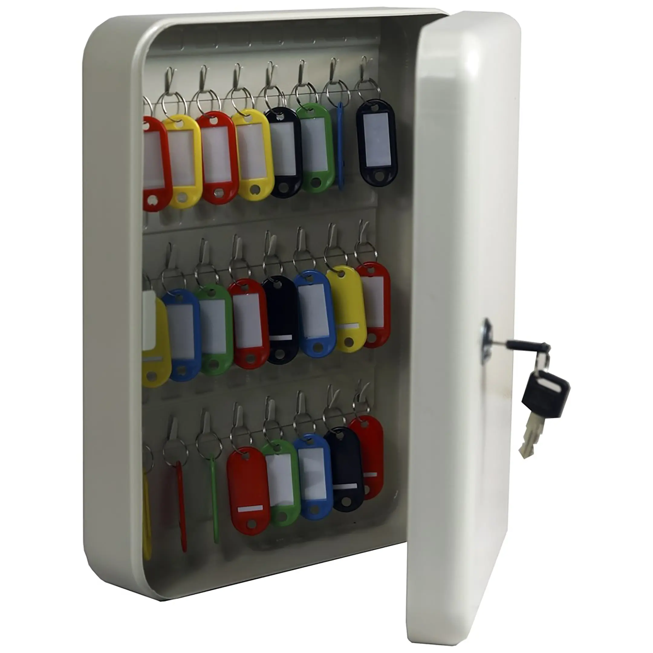 - Готовая система для точного учета и быстрого поиска — сорок восемь пронумерованных ячеек и комплект соответствующих брелков создают четкую и прозрачную систему. Это позволяет вести точный журнал учета, мгновенно находить требуемый ключ и однозначно определять ответственность сотрудников за их выдачу и возврат, исключая ошибки и потери времени.