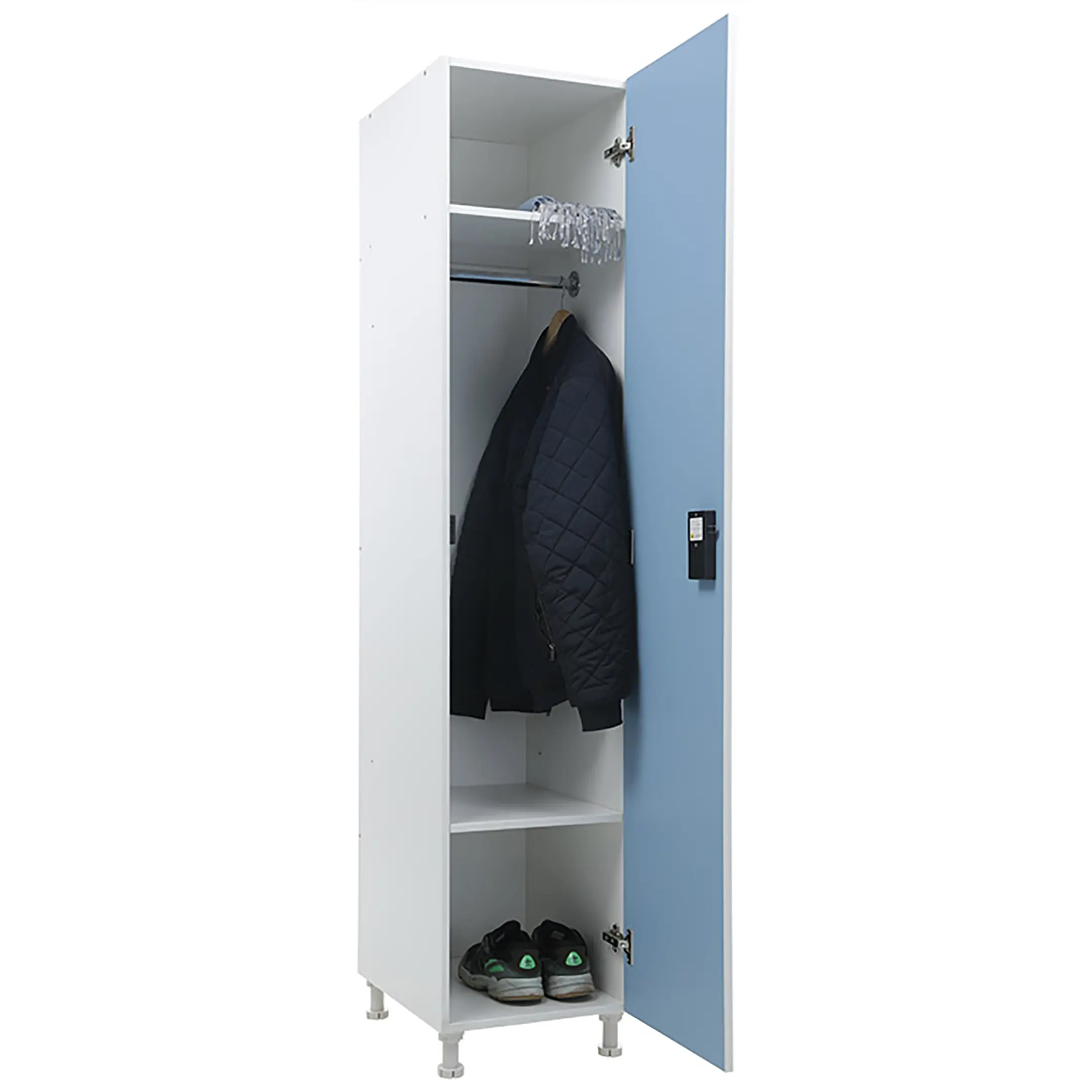 Шкаф для раздевалок WL 11-40 EL голубой/белый — это современное и функциональное решение для хранения одежды в спортивных, производственных, образовательных и других помещениях. Модель изготовлена из высококачественных материалов с применением современных технологий, оснащена электронным замком, выполняющим роль ручки для открывания двери.