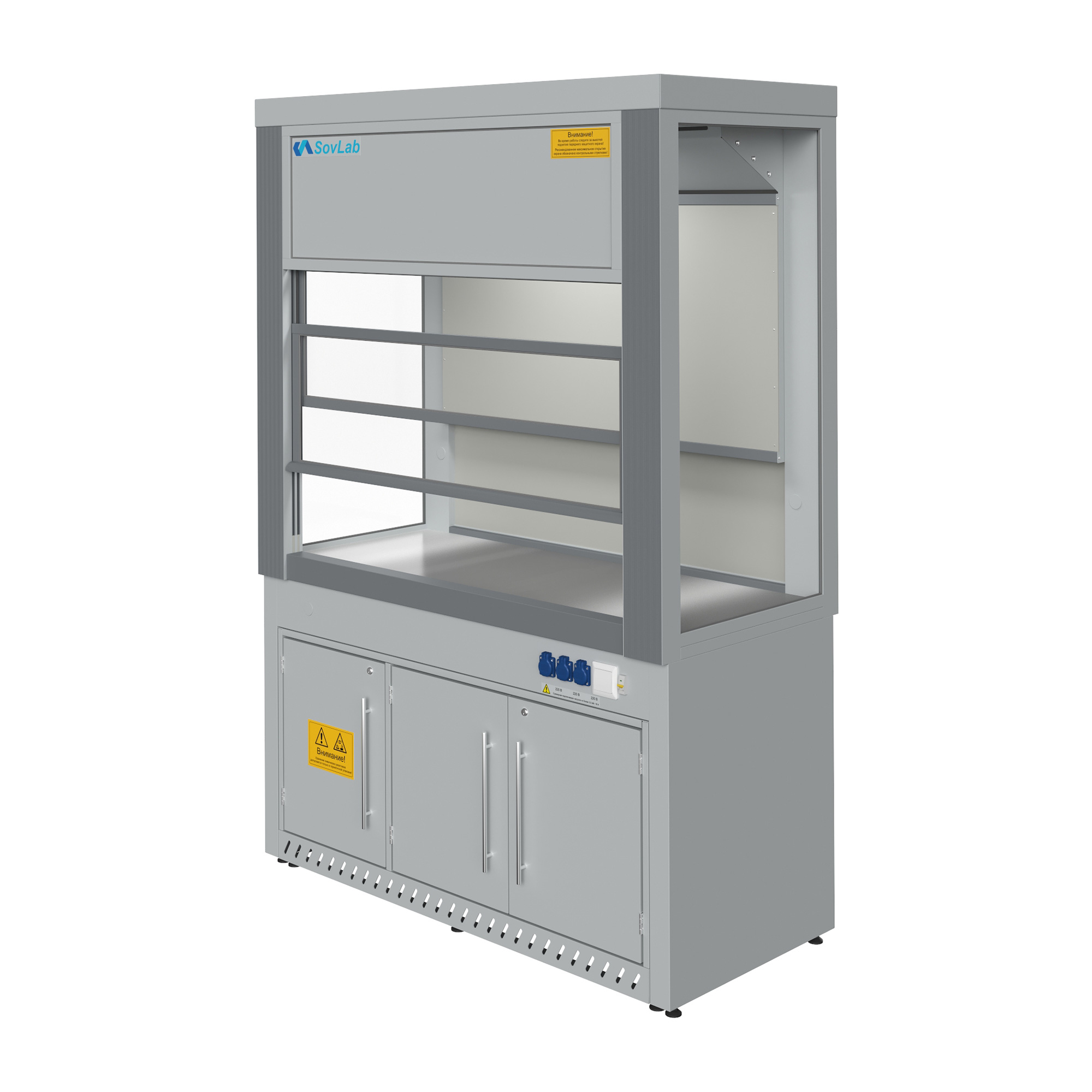 - Безопасная работа с летучими веществами — вертикально-подъемный защитный экран из ударопрочного стекла с системой противовесов для плавного хода и фиксации.