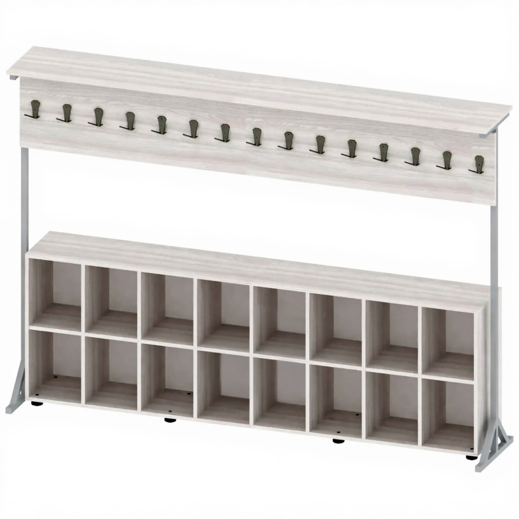 Вешалка напольная односторонняя с полками для обуви на 15 крючков ГР-ШП-3-16 — это практичное и функциональное решение для организации гардеробного пространства в образовательных учреждениях, офисах и общественных помещениях. Модель с односторонней конструкцией оснащена 15 крючками для одежды и удобными полками для обуви, что позволяет комплексно организовать хранение вещей. Вешалка предназначена для размещения верхней одежды, головных уборов и обуви, обеспечивая удобное хранение и поддержание порядка в гардеробной зоне.