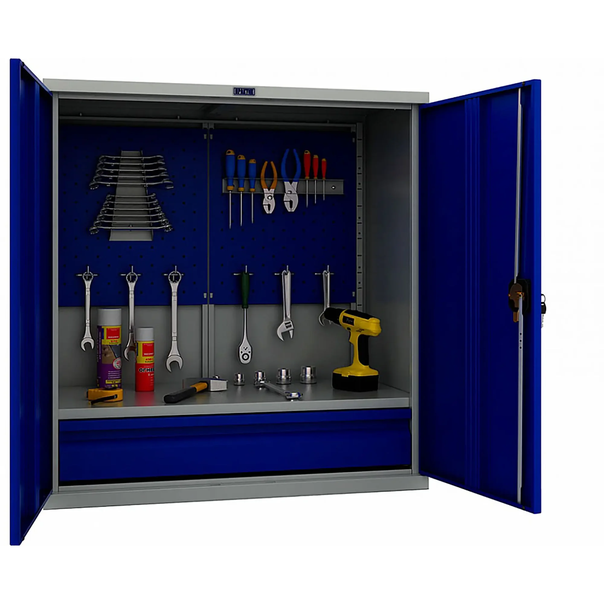 - Надежная защита инструментального парка — цельнометаллический корпус с запирающимися на общий замок дверями обеспечивает высокий уровень безопасности. Это защищает содержимое от краж, несанкционированного доступа, а также от пыли, грязи, стружки и влаги, характерных для производственной среды.