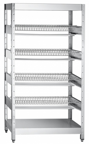 Стеллаж для сушки тарелок ССТ-4-2 с лотком для сбора воды предназначен для сушки и хранения тарелок на предприятиях общественного. Все детали изготовлены из нержавеющей стали. Под каждой кассетой установлен пластиковый лоток. Стеллаж имеет регулируемы по высоте пластмассовые ножки с резиновыми вставками. Конструкция стеллажа разборная.