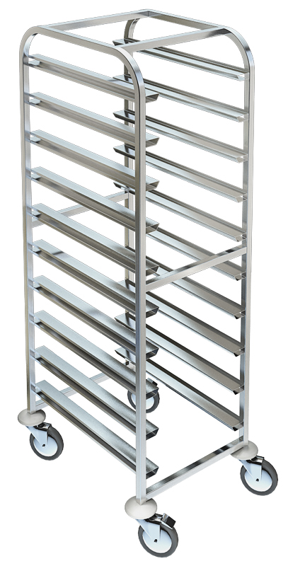 Обвязка, соединяющая края боковин стеллажа-шпильки, выступает в качестве ручек. Противни и гастроемкости размещают на устойчивых к повышенным нагрузкам парных направляющих.