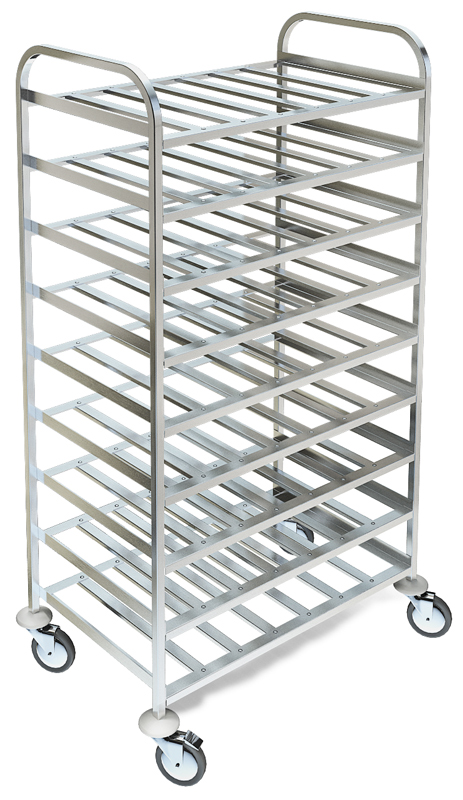 Модель СТС-229/800 целиком изготовлена из нержавеющей стали марки AISI 304. Каркас и полки под подносы и противни свариваются из элементов из квадратной трубы 20х20 мм. На каждом из 9 уровней тележки удастся разместить по 2 подноса размером 505х385 мм. Высота шпильки составляет 150 см.