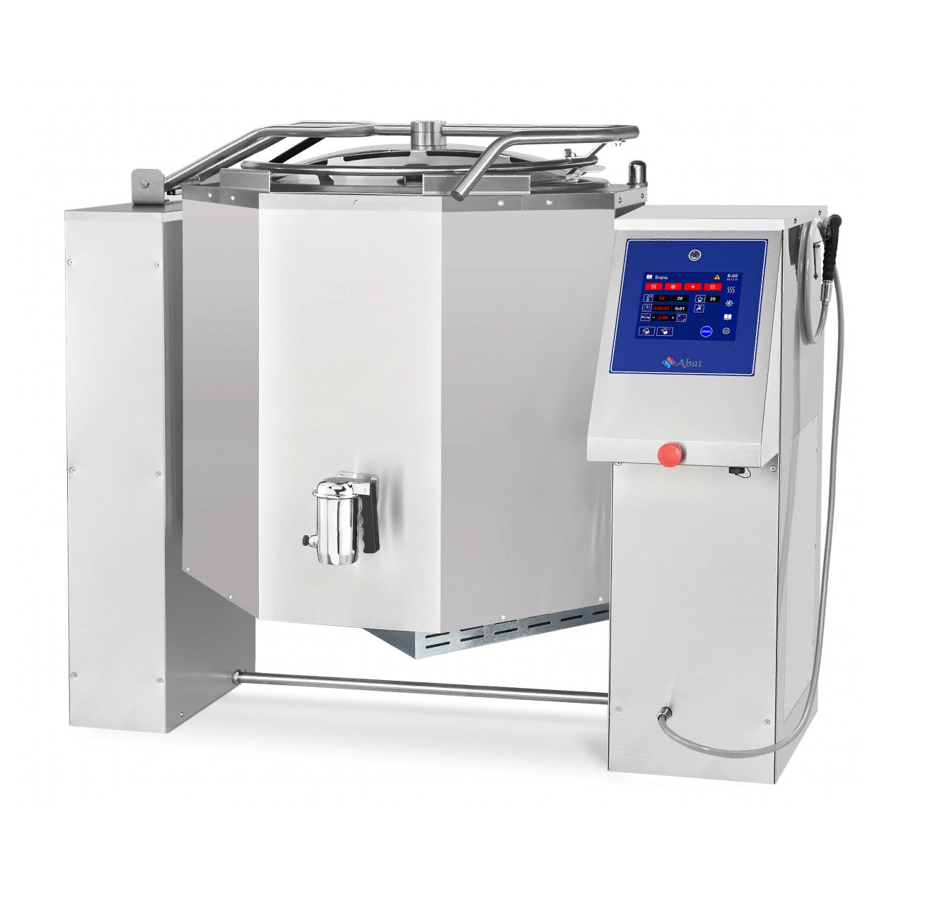 Температура пароводяной рубашки до +120°С, нагрев продукта до +110°С. Контроль уровня воды в рубашке автоматический. Залив воды — мерный или ручной на выбор. Таймер до 10 часов. Крышка фиксируется в верхнем положении, газовые упоры обеспечивают плотное прилегание. Ручной душ для гигиенической чистки.