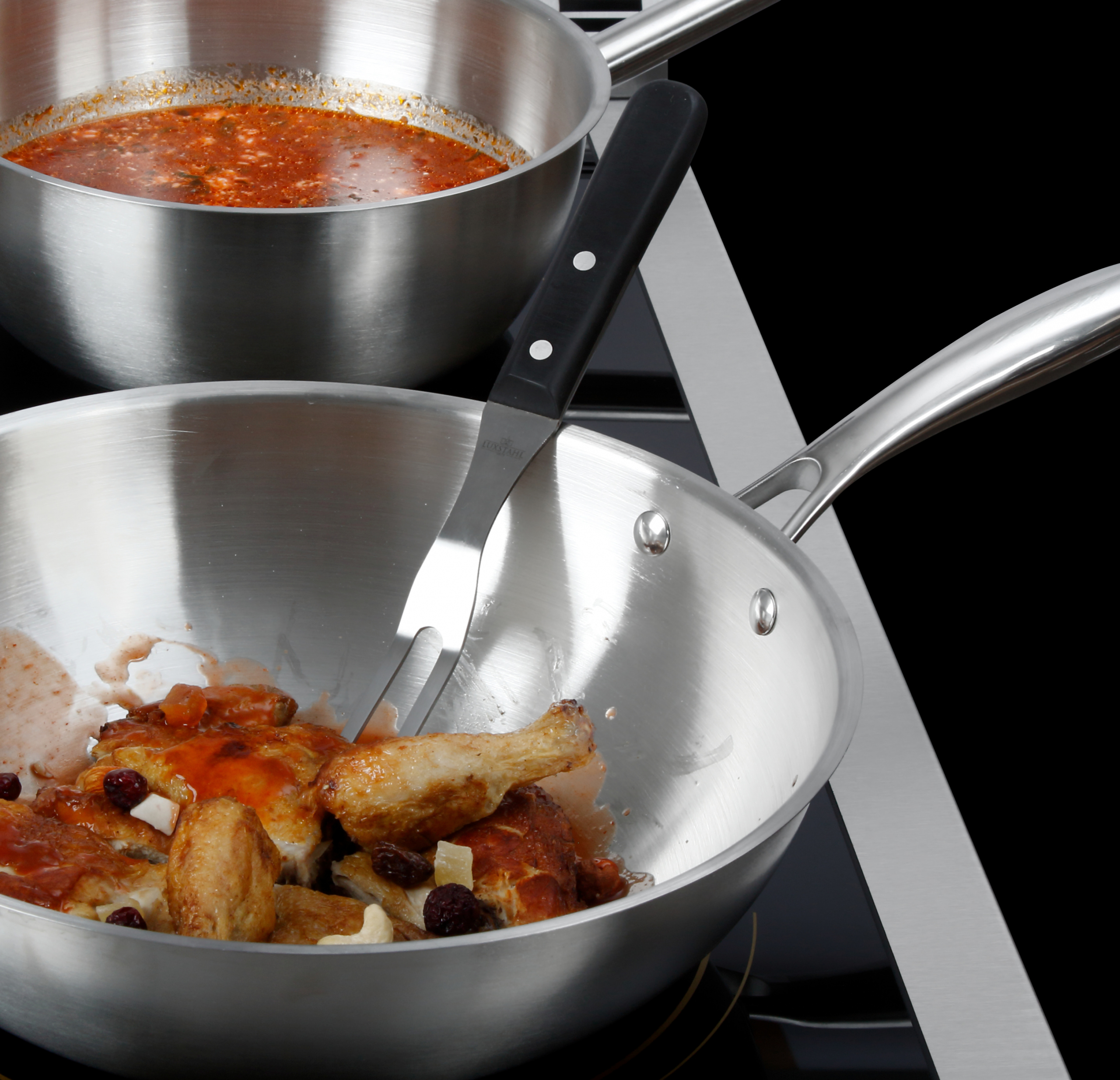 • Автоматическое включение рабочей поверхности только при контакте со специальной посудой, обладающей ферромагнитным свойствами (посуда Luxstahl диаметром 80–450 мм). Для максимальной эффективности и экономии времени рекомендуется посуда Luxstahl диаметром 100–300 мм.