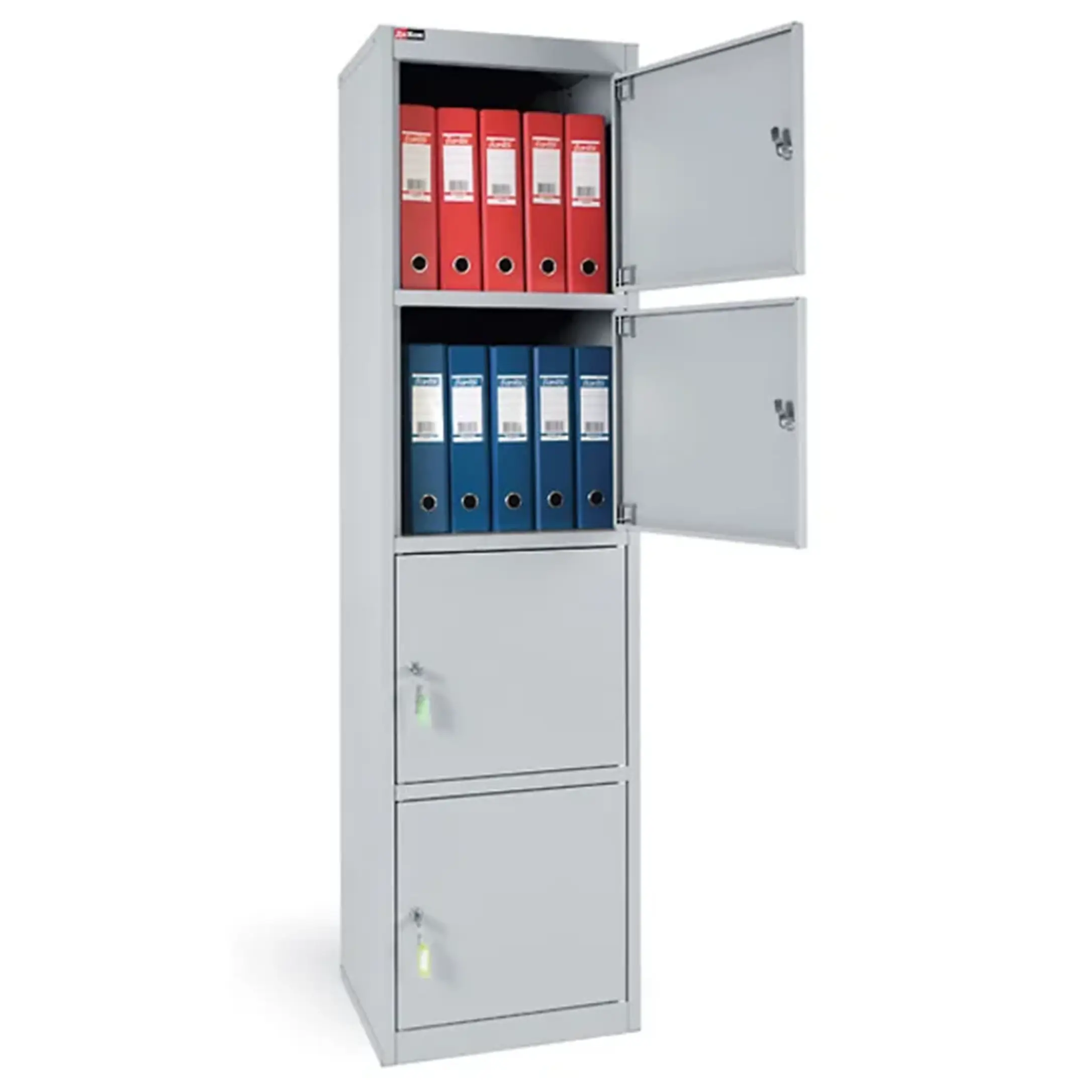 - Прочная и надежная конструкция — шкаф изготовлен из качественной листовой стали с антикоррозийным порошковым покрытием, что обеспечивает долговечность, устойчивость к механическим воздействиям и защиту содержимого. Распашная дверца запирается на надежный встроенный замок с ключом.