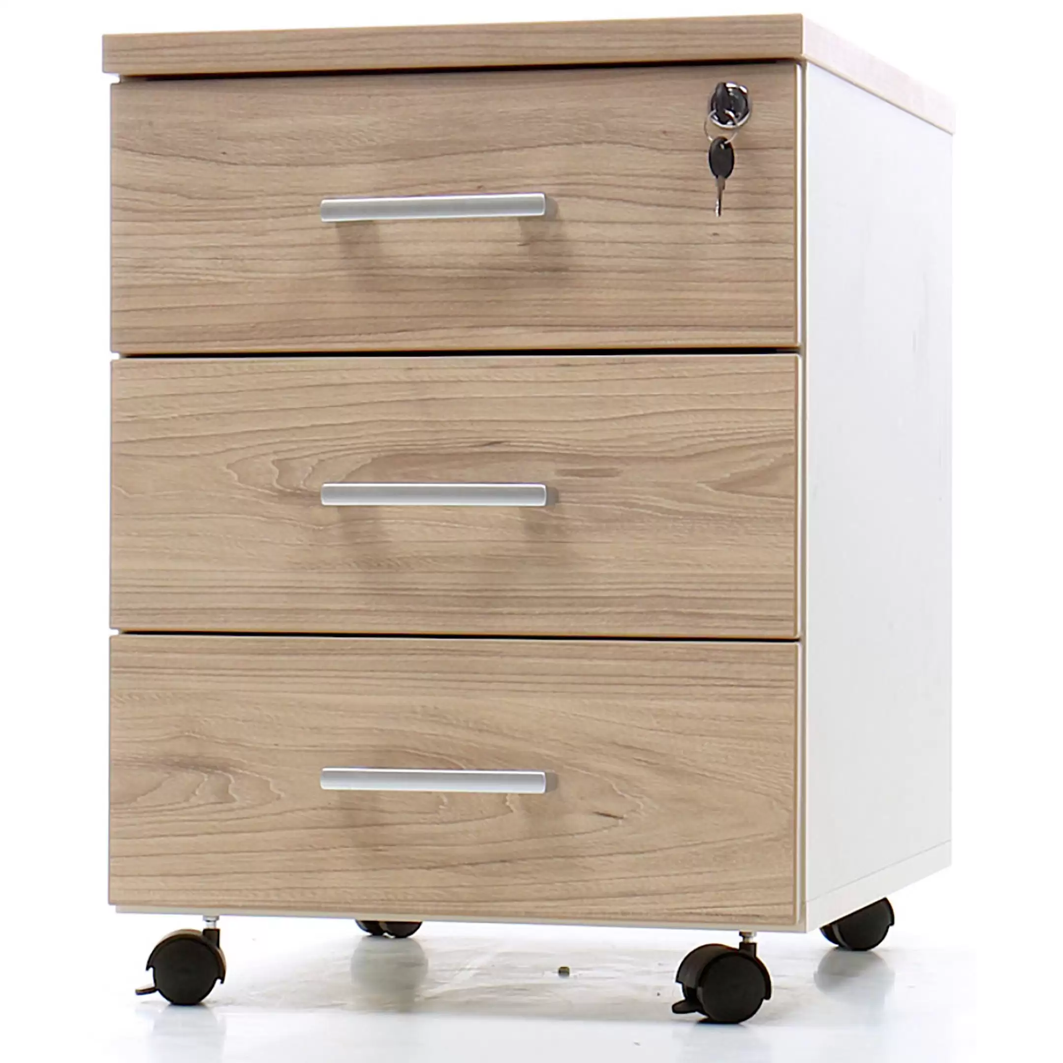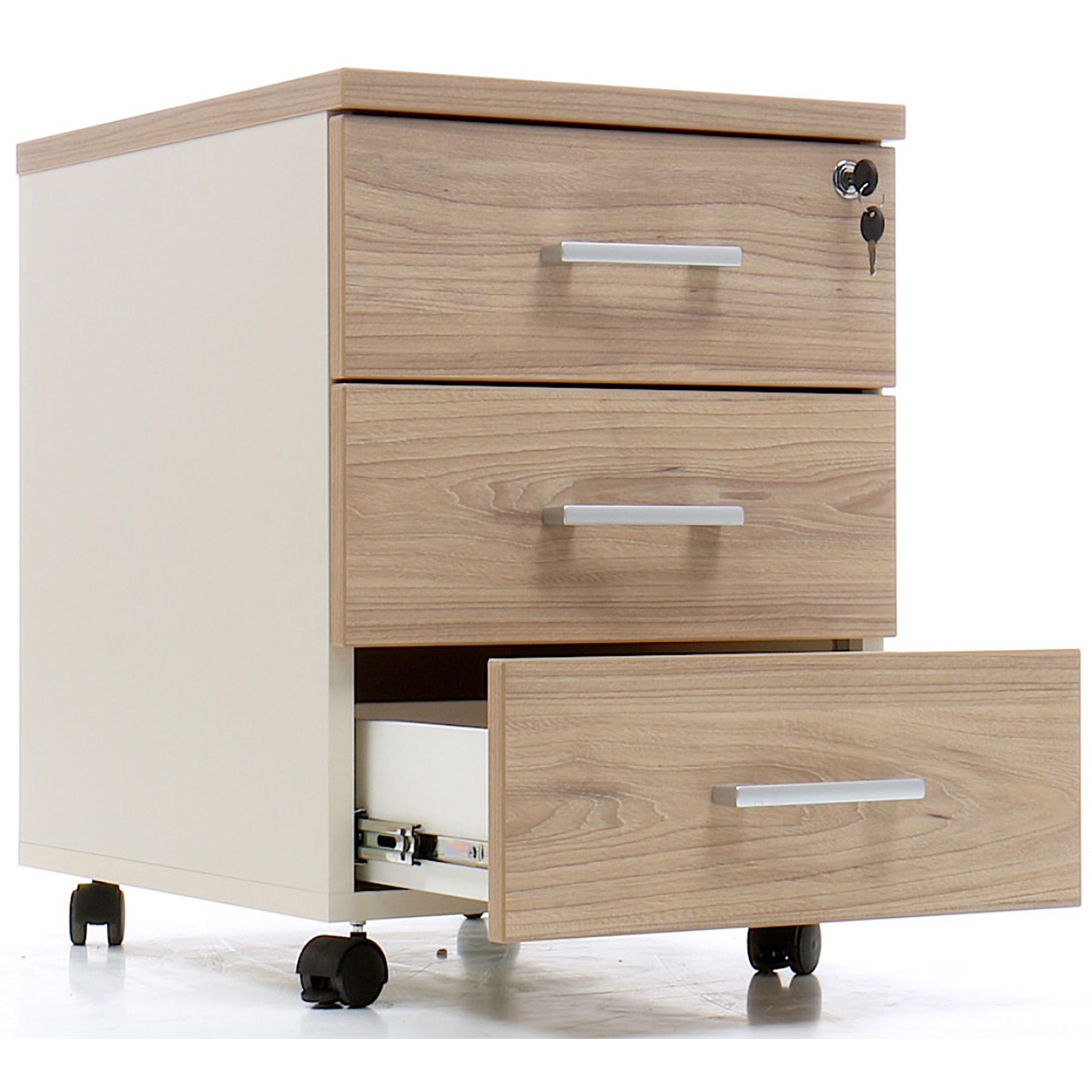• запирается центральным замком и оснащена пластмассовым лотком для канцелярских принадлежностей в верхнем ящике;