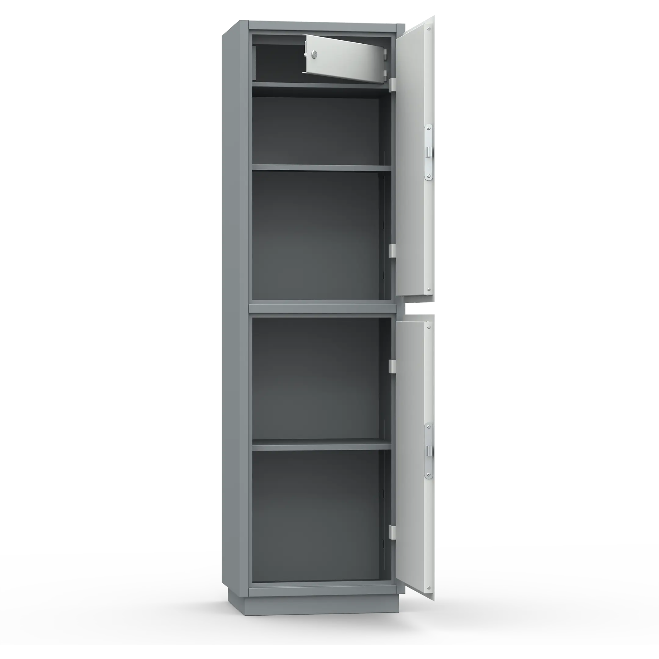 • Вся линейка бухгалтерских шкафов окрашена в два цвета: корпус - RAL 7011, дверь — RAL7035.