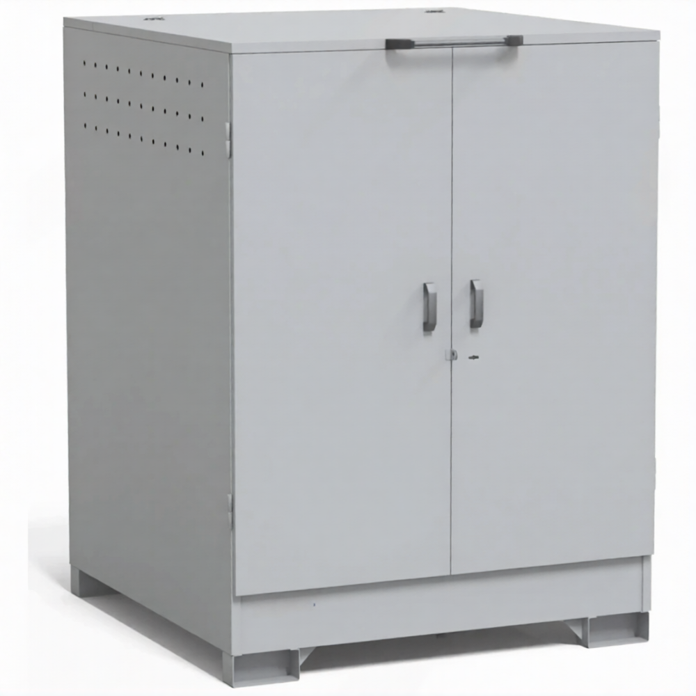 - Защита от несанкционированного доступа и атмосферных воздействий — закрытая запирающаяся конструкция защищает содержимое от кражи, а также от дождя, снега и пыли, что особенно важно при размещении на открытой территории или под навесом.