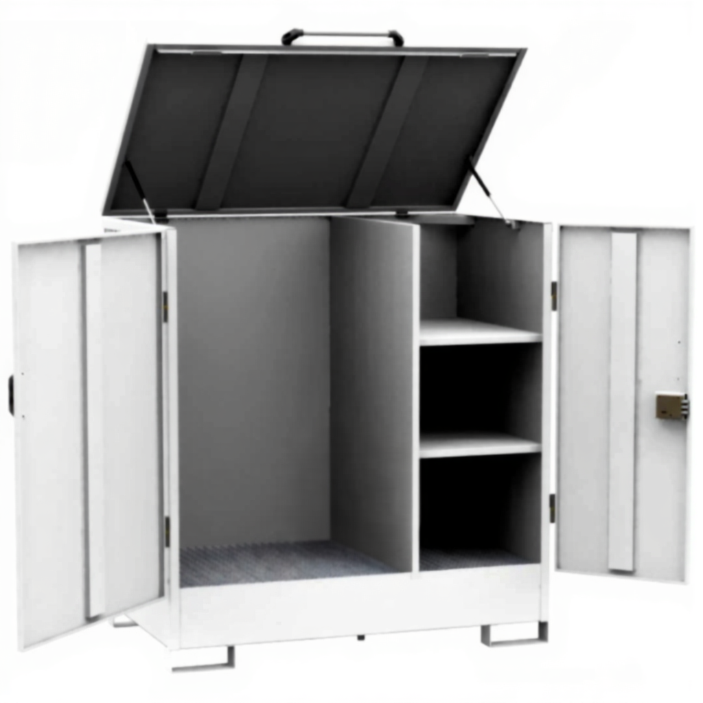 - Защита от несанкционированного доступа и внешних воздействий — запирающаяся конструкция защищает содержимое от кражи, а также от попадания осадков и пыли при уличном или навесном размещении.
